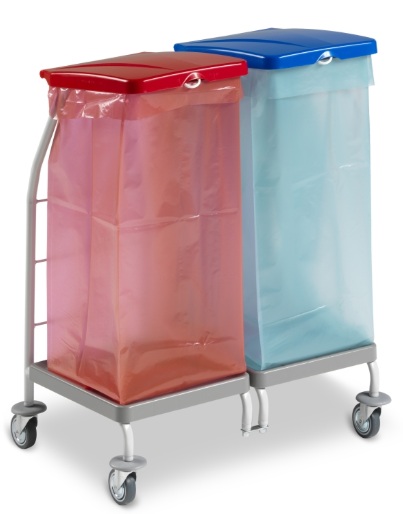 Carrinho para coleta de roupa suja, e pode ser eventualmente utilizado para a recolha de lixos diferenciados, com rodas de 80mm e proteção de rosca. Sem pedal. Sacos não incluidos. Medidas: 48.2x146x95cm.